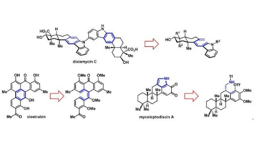 中國(guó)科學(xué)院上海有機(jī)化學(xué)研究所生命有機(jī)化學(xué)國(guó)家重點(diǎn)實(shí)驗(yàn)室李昂課題組發(fā)展了環(huán)化/芳構(gòu)化的合成策略,通過自主合成芳環(huán)的方式,解決以上策略性問題,實(shí)現(xiàn)了含多取代芳環(huán)的xiamycin家族、clostrubin...