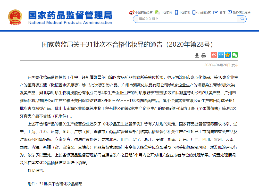 國家藥監局通告31批次不合格化妝品