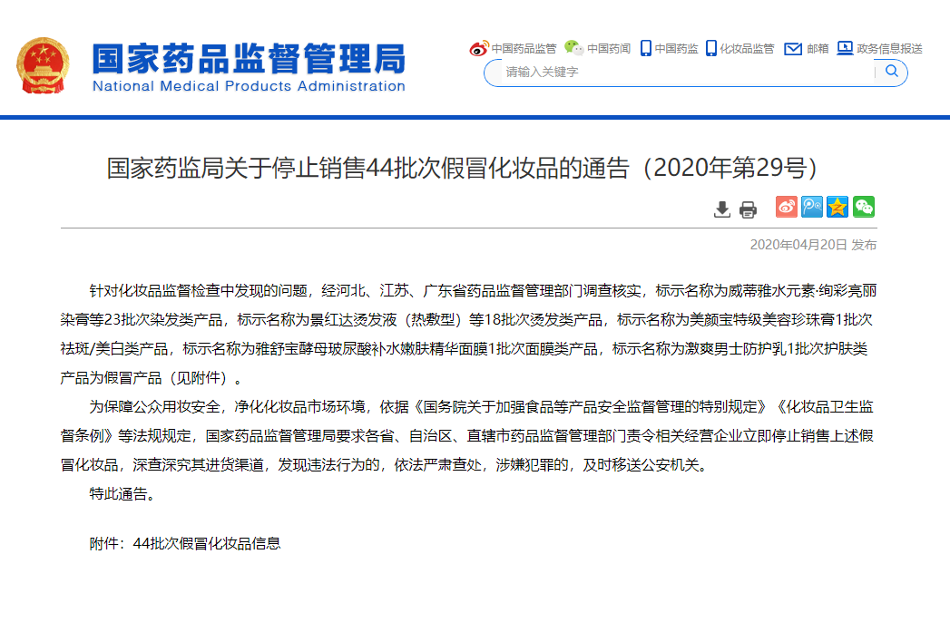 國家藥監局關于停止銷售標示名稱為浩鑫染發膏(霜)等76批次假冒化妝品的通告(2020年第12號)