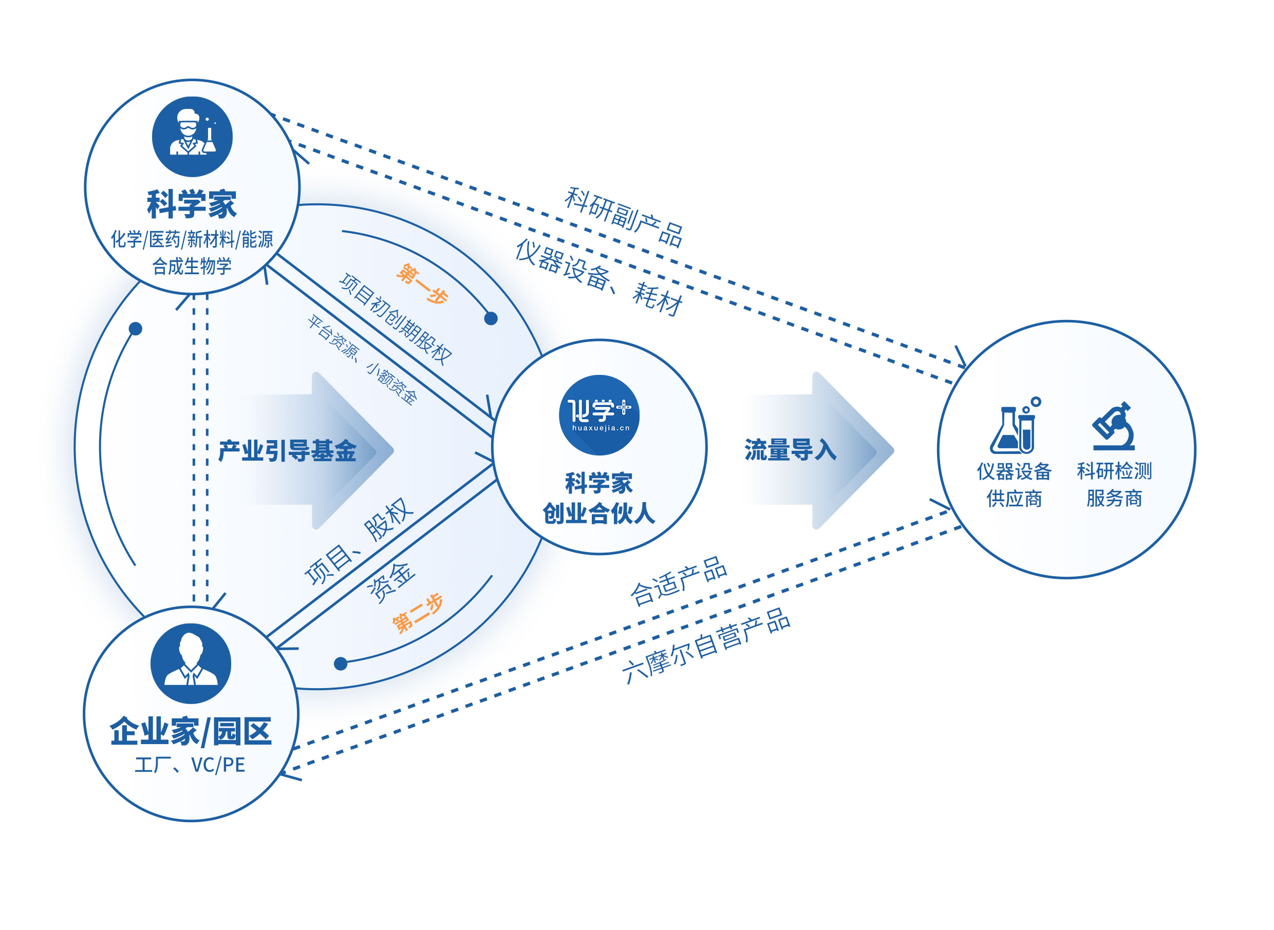 作為科學家創業合伙人這一角色,在科學家的橫向研究、創業項目、創業公司初始階段,化學加可以起到關鍵的角色互補作用,為項目、為科學家提供包括市場調研、企業需求對接、融資對接、園區入駐、品牌營銷(IP打造)、人才推薦等服務。
