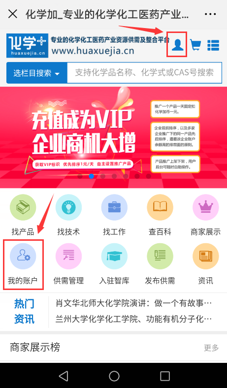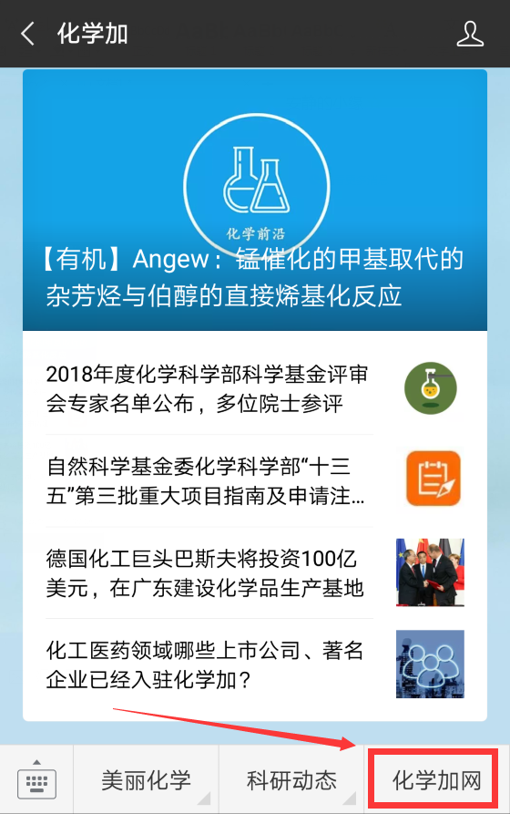 2.關(guān)注微信公眾號化學(xué)加,菜單欄右下角即有“化學(xué)加網(wǎng)”按鈕,點擊即可進入。