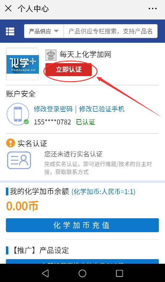 2.在個人中心如果有立即認證的紅色按鈕,說明還未認證,需要點擊立即認證,填寫好企業(yè)資料提交審核來開通店鋪。