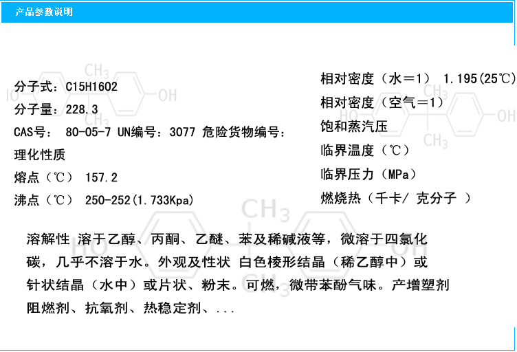 產(chǎn)品優(yōu)勢: 1.俄羅斯進(jìn)口,質(zhì)量穩(wěn)定,價(jià)格合理; 2.小噸位起訂,方便客人使用; 3.積累大量新老客戶的使用經(jīng)驗(yàn),可以協(xié)助解決某些技術(shù)方面的問題; 中文名:雙酚A;二酚基丙烷 英文名: BisphenolA.BPA.4,4'-(1-Methylethyliden)bisphenol, 4,4'-Isopropylidendiphenol4,4'-(1-Methylethyliden)bisphenol, 4,4'-Isopropylidendiphenol ??化學(xué)類別: ??分子式:C15H16O2 ??分子量:228.3 ??CAS號: 80-05-7 UN編號:3077 危險(xiǎn)貨物編號: ??理化性質(zhì) ??熔點(diǎn)(℃) 157.2 ??沸點(diǎn)(℃) 250-252(1.733Kpa) ??相對密度(水=1) 1.195(25℃) ??相對密度(空氣=1) ??飽和蒸汽壓 ??臨界溫度(℃) ??臨界壓力(MPa) ??燃燒熱(千卡/ 克分子 ) ??溶解性:溶于乙醇、丙酮、乙醚、苯及稀堿液等,微溶于四氯化碳,幾乎不溶于水。 ?? 外觀及性狀 白色棱形結(jié)晶(稀乙醇中)或針狀結(jié)晶(水中)或片狀、粉末。可燃,微帶苯酚氣味。產(chǎn)增塑劑、阻燃劑、抗氧劑、熱穩(wěn)定劑。 雙酚A是世界上使用最廣泛的工業(yè)化合物之一,主要用于生產(chǎn)制造高分子材料如聚碳酸酯、環(huán)氧樹脂、聚砜樹脂、聚苯醚樹脂、不飽和聚酯樹脂、酚醛不飽和樹脂、聚醚酰亞胺等多種高分子材料。也可用于生產(chǎn)增塑劑、阻燃劑、抗氧劑、聚氯乙烯熱穩(wěn)定劑、橡膠防老劑、農(nóng)用殺菌劑、油漆、涂料、紫外線吸收劑等精細(xì)化工產(chǎn)品。 在塑料制品的制造過程中,添加雙酚A可以使其具有無色透明、耐用、輕巧和突出的防沖擊性等特性,尤其能防止酸性蔬菜和水果從內(nèi)部侵蝕金屬容器,因此廣泛用于罐頭食品和飲料的包裝、奶瓶、水瓶、牙齒填充物所用的密封膠、眼鏡片以及其他數(shù)百種日用品的制造過程中。